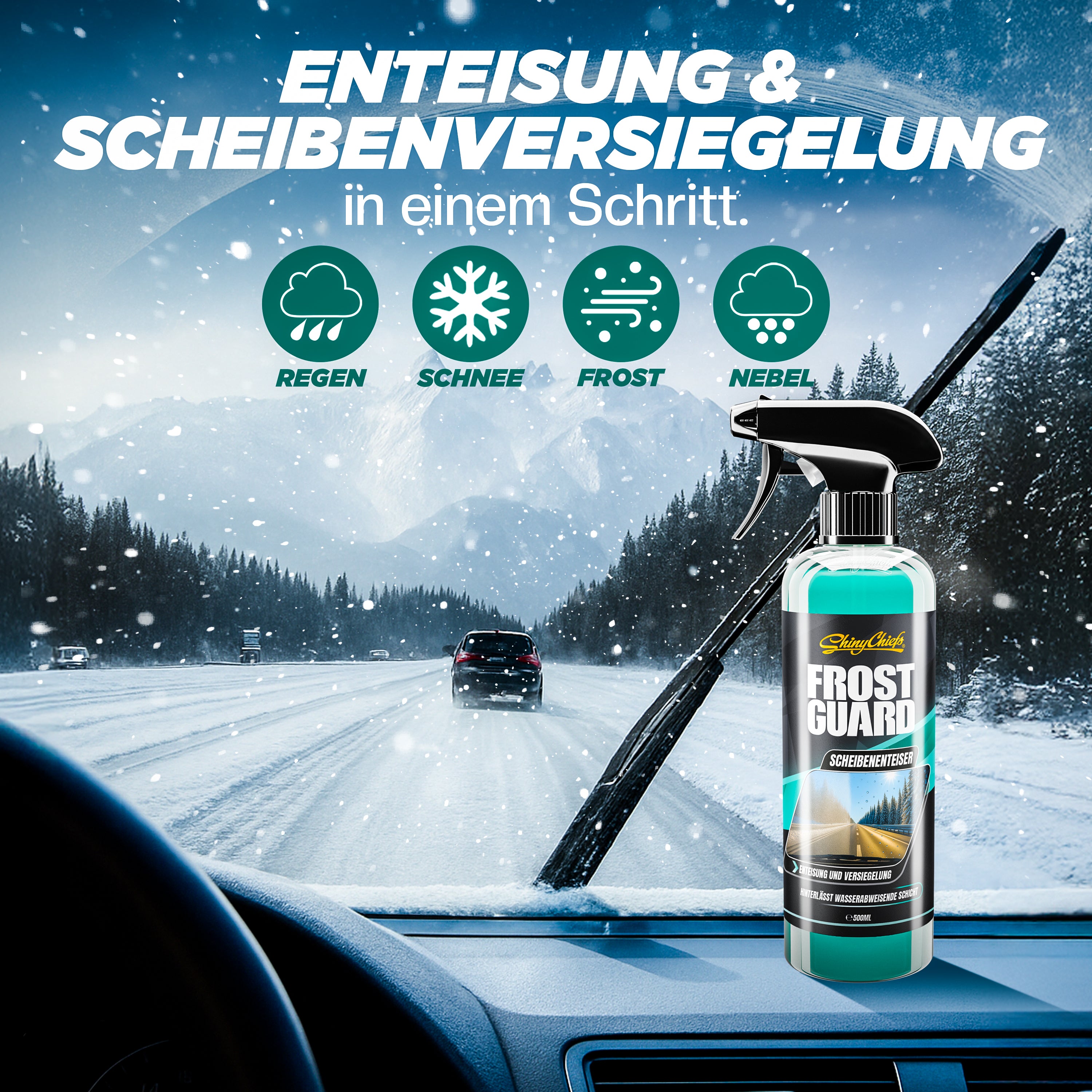 ShinyChiefs FROST GUARD befreit in Sekundenschnelle Eis von allen zugefrorenen Scheiben, Außenspiegeln und Scheinwerfern. Das hoch konzentrierte Enteisungsspray sorgt sofort für klare Sicht und erhöht damit zuverlässig die Fahrsicherheit – ganz ohne mühsames Eiskratzen und ohne das Risiko verkratzter Scheiben. Das enthaltene Glycerin hält Wischergummis und andere Gummiteile geschmeidig und verhindert ein Festfrieren. Mit jedem Sprühstoß legt der FROST GUARD eine unsichtbare Schutz- und Versiegelungsschicht auf die Glasoberfläche. Diese Versiegelung unterstützt nicht nur das Abperlen von Wasser, sondern verhindert auch effektiv eine schnelle Wiedervereisung der Scheibe. So bleibt die Sicht länger klar und der erneute Eisansatz wird deutlich reduziert. Die darunterliegende Schutzschicht bleibt dabei
