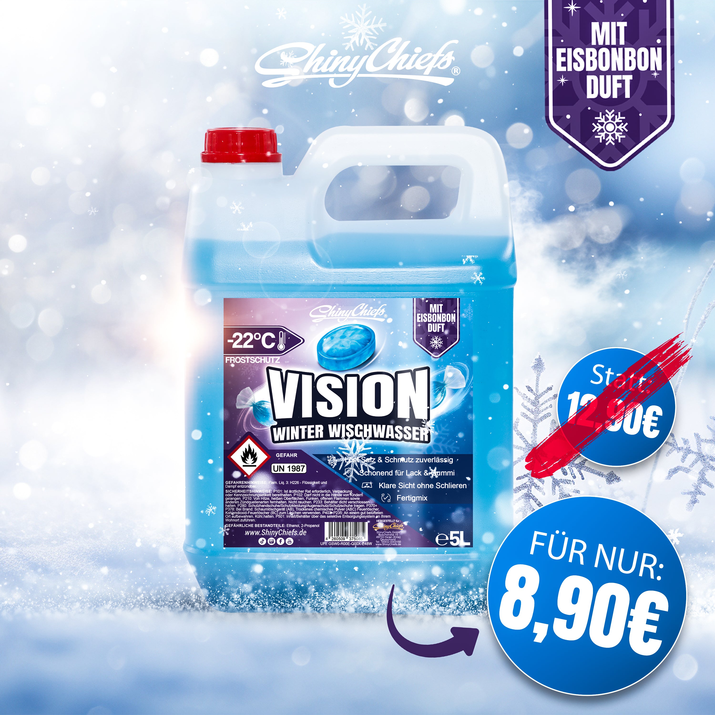 ShinyChiefs VISION ist ein Scheibenreiniger mit einem herrlichen Eisbonbonduft für die Scheibenwaschanlage im Winter. Gebrauchsfertig bis zu -22°C. Schafft Durchblick im winterlichen Straßenverkehr - ohne zu schlieren! Für Polykarbonatscheiben und Fächerdüsen geeignet. Dieser Scheibenreiniger reinigt aktiv gründlich und schlierenfrei. Extreme Reinigungskraft mit deutlich reduzierten Verbrauch sorgt für mehr Sicherheit. VISION verhindert zuverlässig das schnelle Nachvereisen gereinigter Flächen. Außerdem schützt es sicher die gesamte Scheibenwaschanlage vor dem Einfrieren. Absolut lack-, gummi- und kunststoffverträglich.