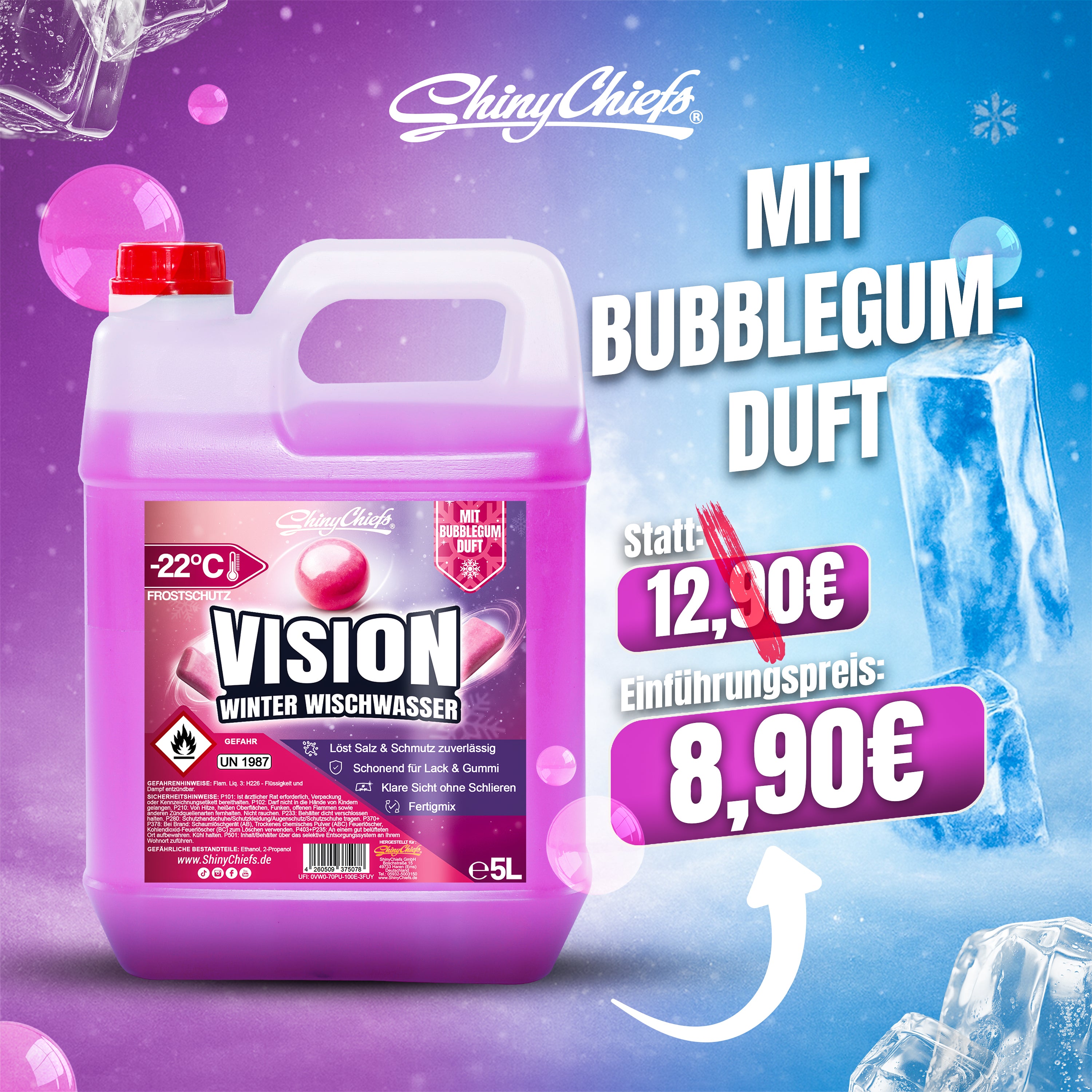ShinyChiefs VISION ist ein Scheibenreiniger mit einem herrlichen Bubblegumduft für die Scheibenwaschanlage im Winter. Gebrauchsfertig bis zu -22°C. Schafft Durchblick im winterlichen Straßenverkehr - ohne zu schlieren! Für Polykarbonatscheiben und Fächerdüsen geeignet. Dieser Scheibenreiniger reinigt aktiv gründlich und schlierenfrei. Extreme Reinigungskraft mit deutlich reduzierten Verbrauch sorgt für mehr Sicherheit. VISION verhindert zuverlässig das schnelle Nachvereisen gereinigter Flächen. Außerdem schützt es sicher die gesamte Scheibenwaschanlage vor dem Einfrieren. Absolut lack-, gummi- und kunststoffverträglich.